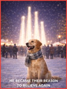 Then came the night the town gathered beneath glowing lights and falling snow. Music played. Voices filled the air. And there he was, as always — sitting patiently nearby, his owner just out of frame, letting him be exactly what he had become for so many. That moment didn’t create his meaning. It revealed it.